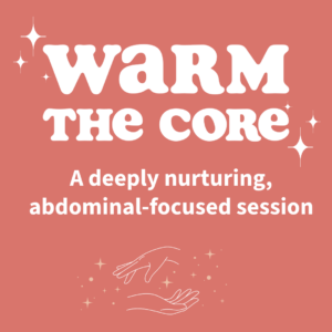 A deeply nurturing, abdominal-focused session designed to encourage internal warmth and ease stagnation. A custom castor oil blend and warming wrap are used to support circulation, digestion, and reproductive wellness. While the abdomen is cocooned in warmth, focused neck and jaw massage helps calm the nervous system before returning to the belly for grounding integration.